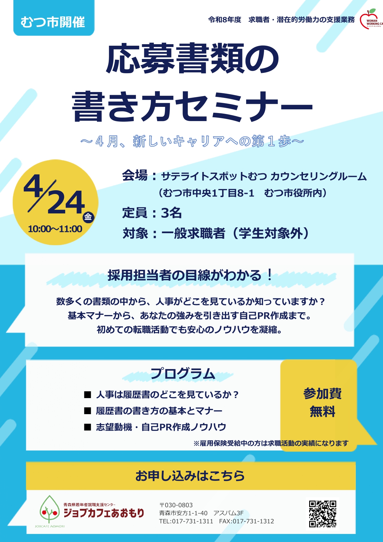 一般求職者 年齢制限なし(学生対象外)※恐れ入りますが、45歳以上の方につきましてはお電話、FAX、またはサテライトスポットむつでのお申し込みをお願いいたします。
